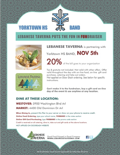 Go to the Westover Lebanese Taverna restaurant at 5900 Washington Blvd or Market at 4400 Old Dominion Blvd., mention Yorktown High School Marching Band (use promo code BAND) and 20% of your bill is donated to the Band Boosters!